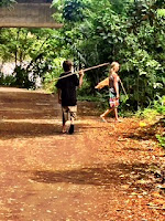 Pictures: My tribe headed to San Jose; Mags and her huge leaf; Ethan's Sacred Staff of the 7th Mohave Tribe; Showing his sister his treasure; The kids with a cow outside the hotel representing Costa Rican Coffee trade